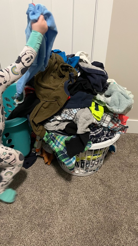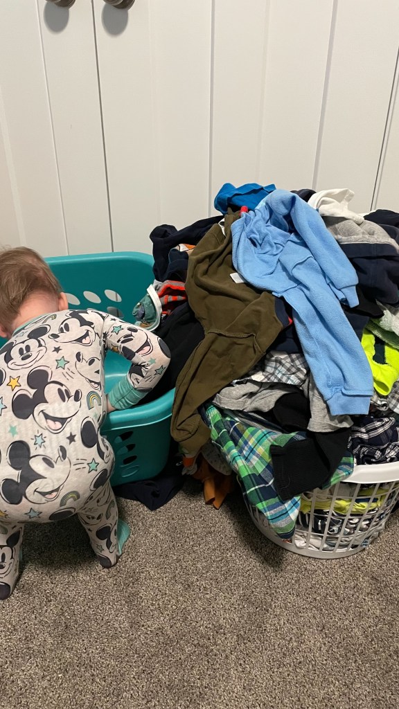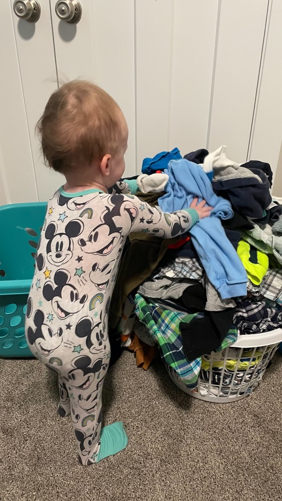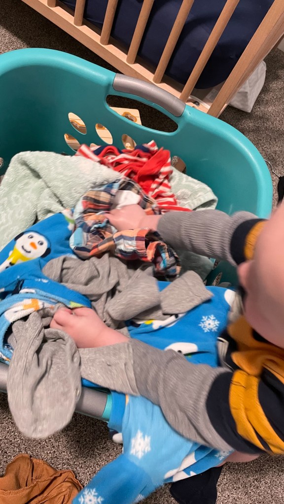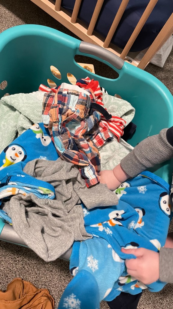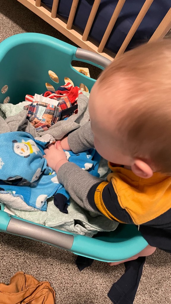 There is just something fun about throwing clothes out of a laundry basket. My son has been doing this since he was around 10 months old.