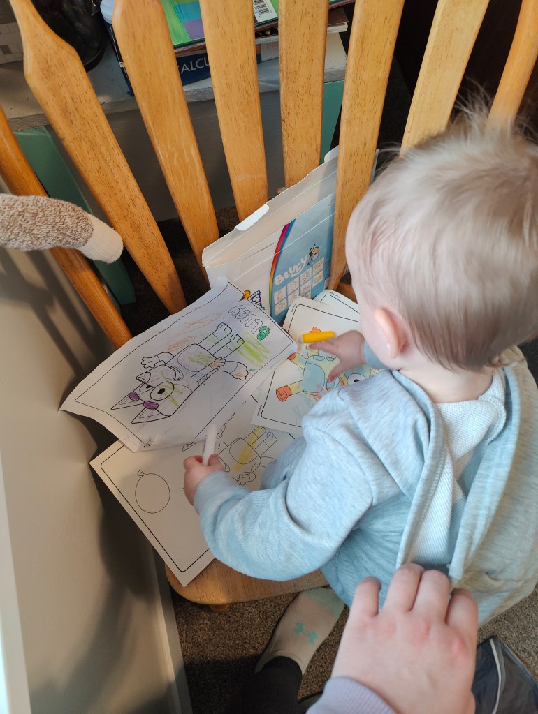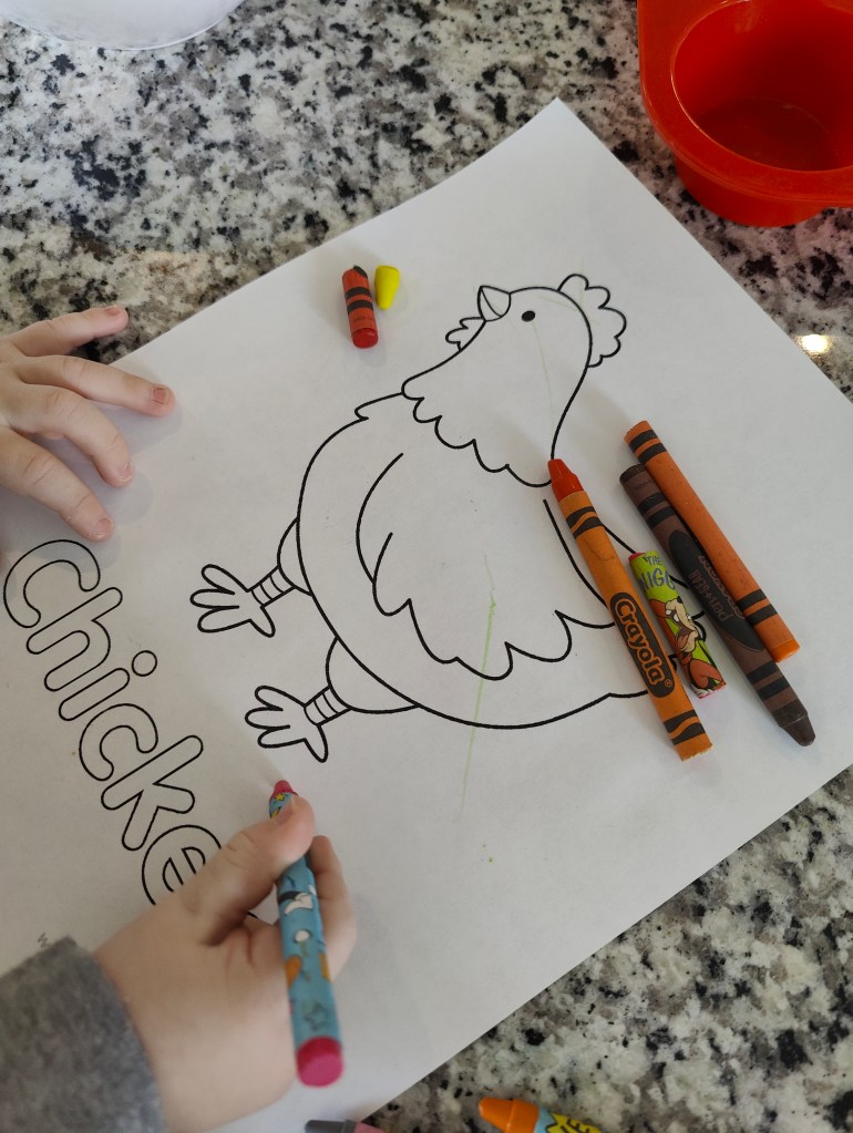 There are so many free coloring pages online, just print some out and give your little one some crayons! **There are some very cool coloring books you can buy that have colorless markers. The markers only work on the coloring pages and don’t get on walls or clothes!