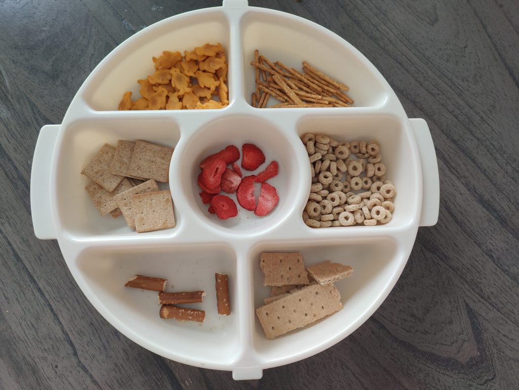 I have a random dip container that I never use. One day I put different foods with different textures in each section. The first time I did this activity, I remember sending a text to my husband excited that our son had been playing with it uninterrupted for 30 minutes. It was awesome. This is another messy activity but it only requires a vacuum later. I also like to add some spoons and cups to make it more fun.