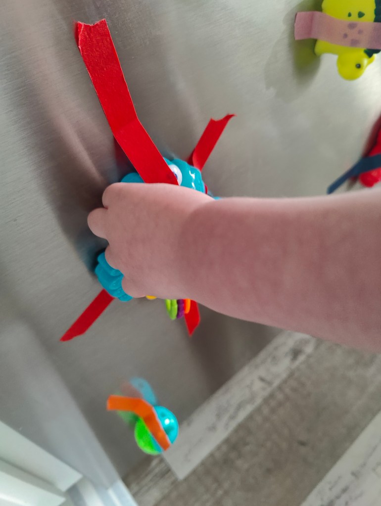 Taping Toys to Fridge