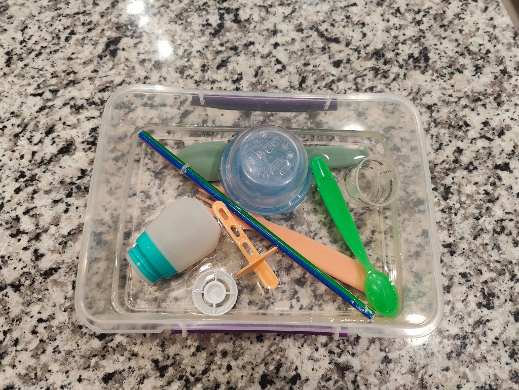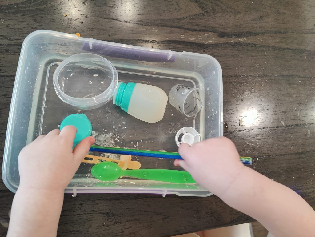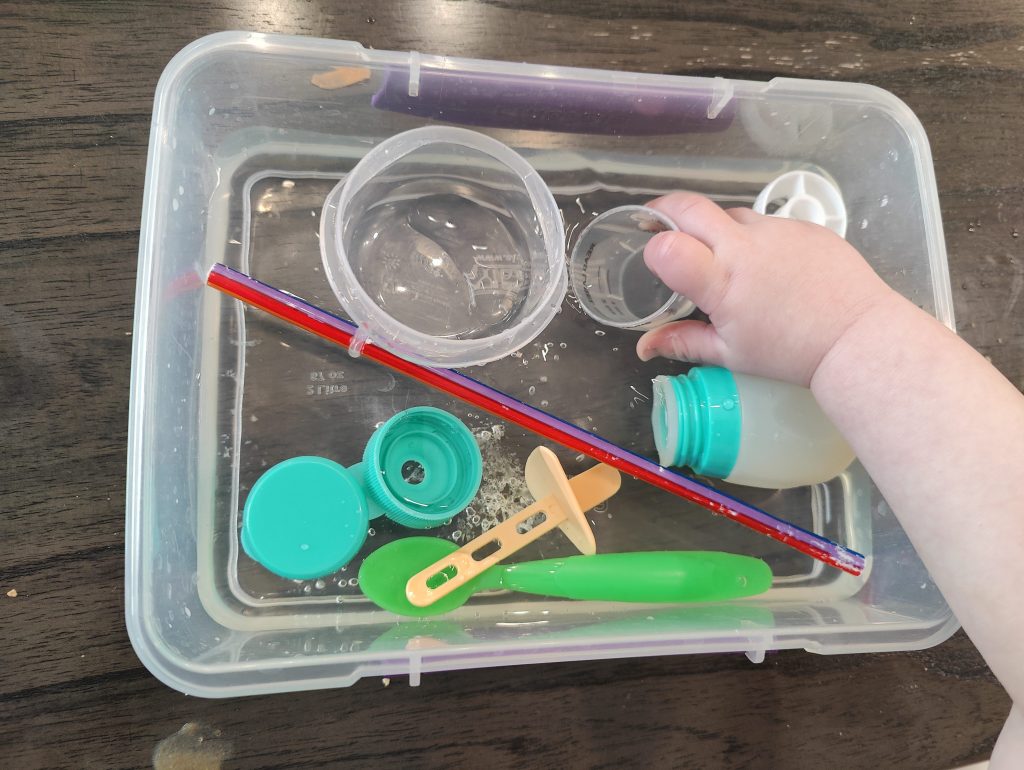 My son loves playing in water. So, if I don’t want to get him in the bath, I will put him in his highchair with towels underneath it, and give him this activity. I get a large or medium Tupperware, fill it up a third of the way, and then put lots of random objects from the kitchen in it. Some objects include baby spoons, straws, medicine cups, silicone muffin cups, teaspoons, etc. This is a messy activity so you’ll want to have towels on the ground and be prepared for the possibility of your child dumping the water out.